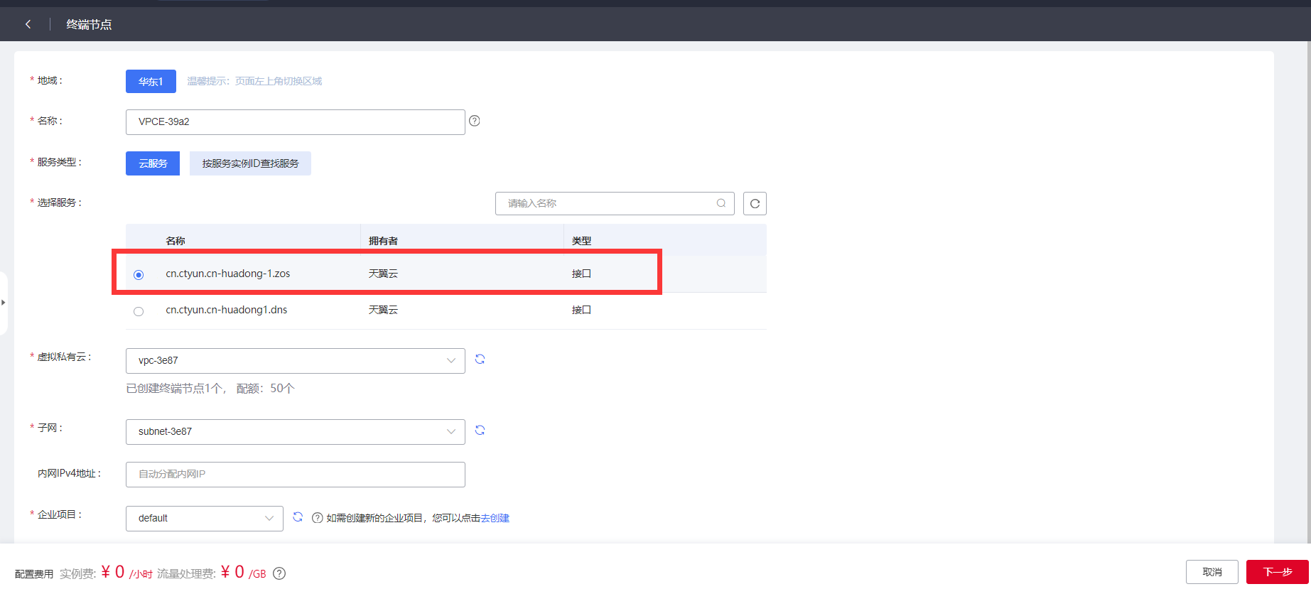 7、在终端节点控制台中,选择已创建的终端节点,该终端节点的接入地址即为该VPC内,通过VPC终端节点访问对象存储的地址。