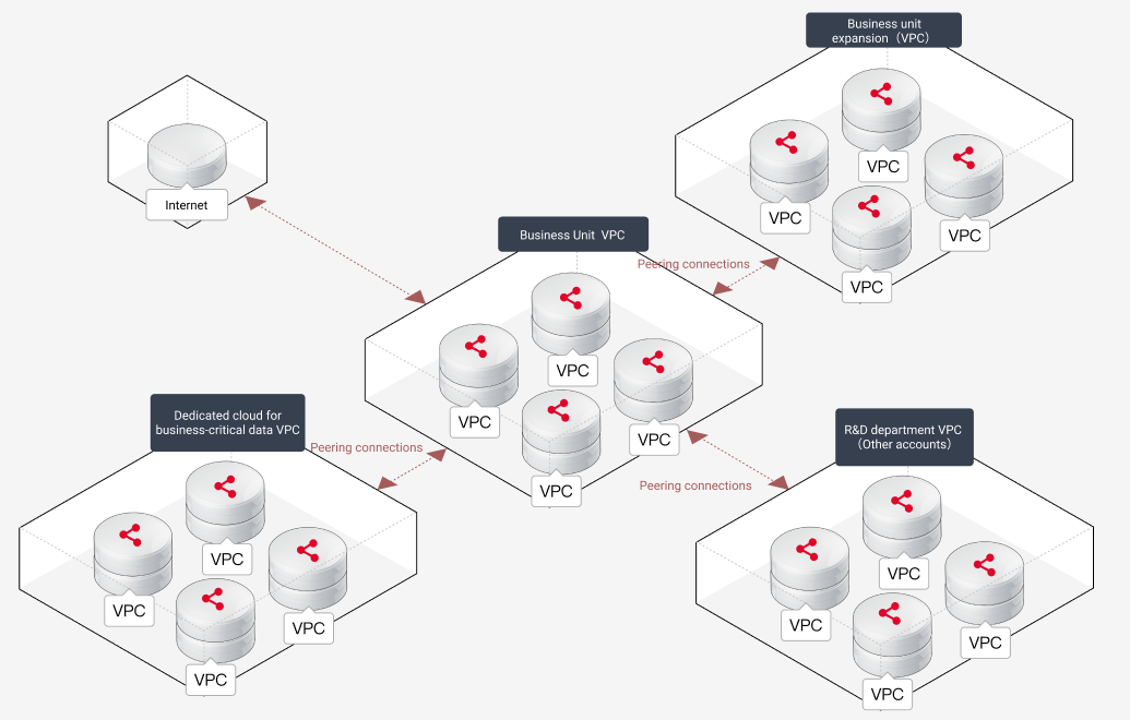 - When the resources of different business departments need to interconnect with each other, the Peering can be used to connect the VPCs under the two accounts, thereby realizing access to cloud resources within the Intranet. The connection process of the Peering requires both parties to confirm with each other to ensure security. At the same time, with the continuous development of business, when resources and network architecture can no longer meet business needs, the new resources such as new VPCs and ECSs created for the new business can be interconnected with original resources through the Peering, to easily realize business deployment.