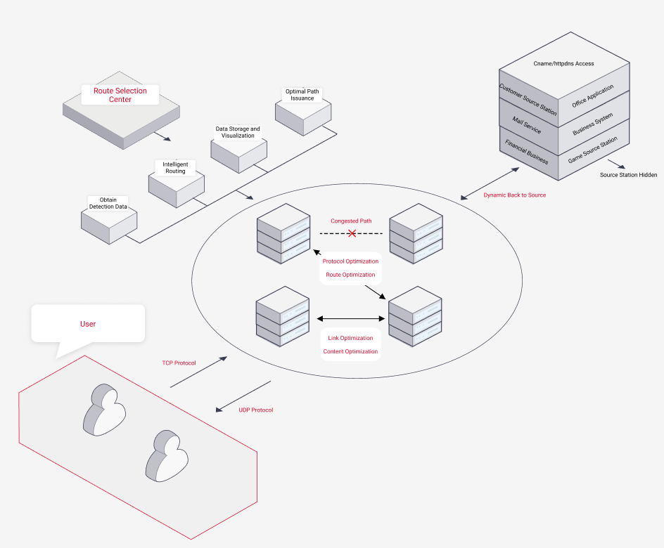 Collaborate with edge and origin to build a distributed security defense line, which can achieve transport layer acceleration and zero-latency link switching to ensure data security and transmission reliability.