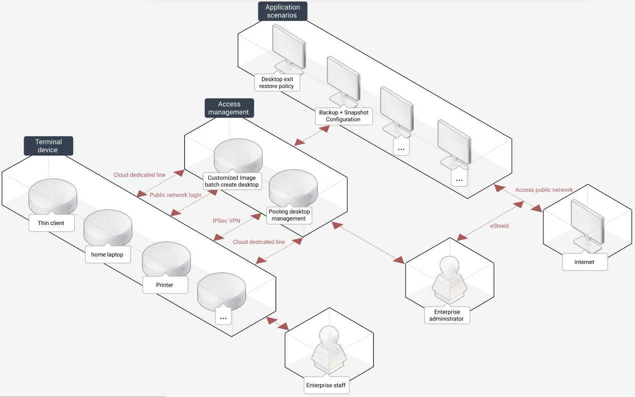 - Cloud Laptop + management and control policies + eShield (optional, see product features for details)