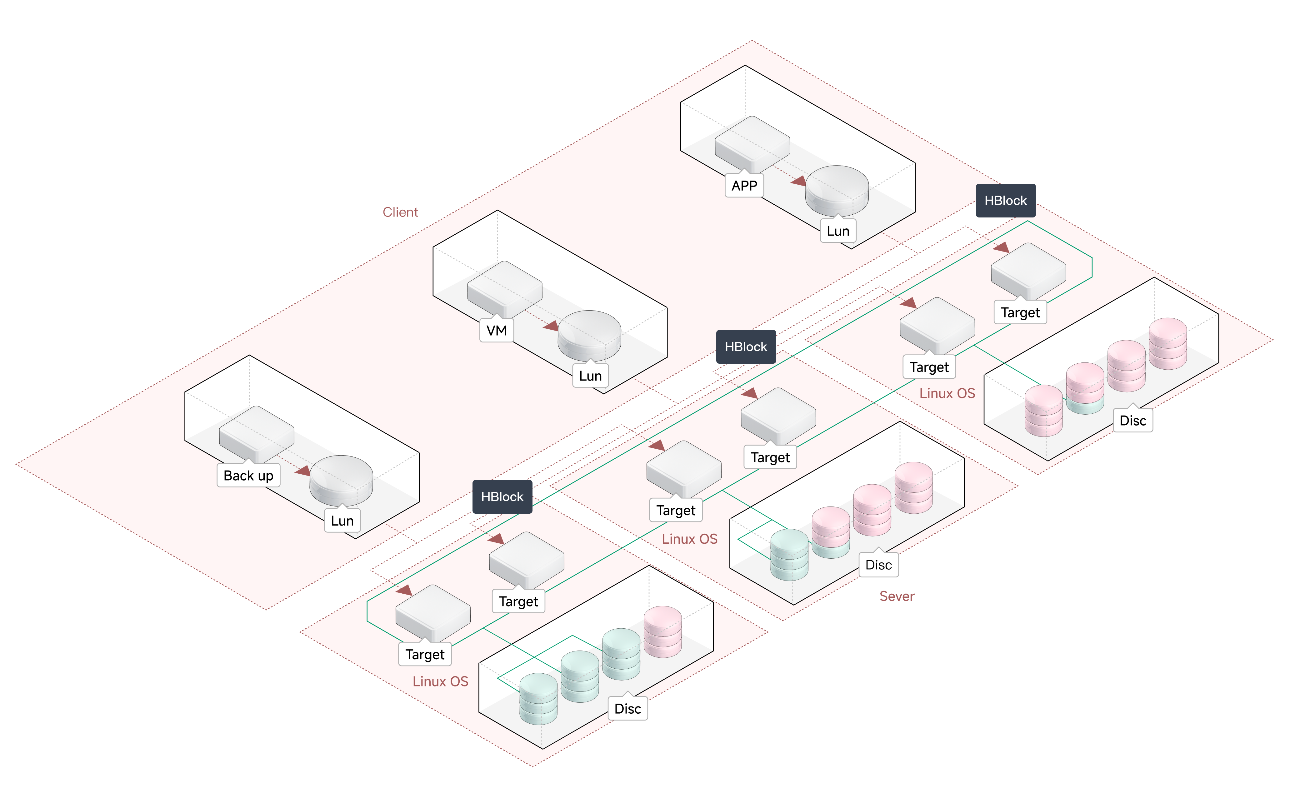 - For applications, databases, file storage, and other businesses that require the deployment of a large number of computing and storage nodes, you can use HBlock to manage the physical disks of application nodes, and mount the virtual disks to the local application nodes for local applications. No need to purchase and maintain additional storage hardware.