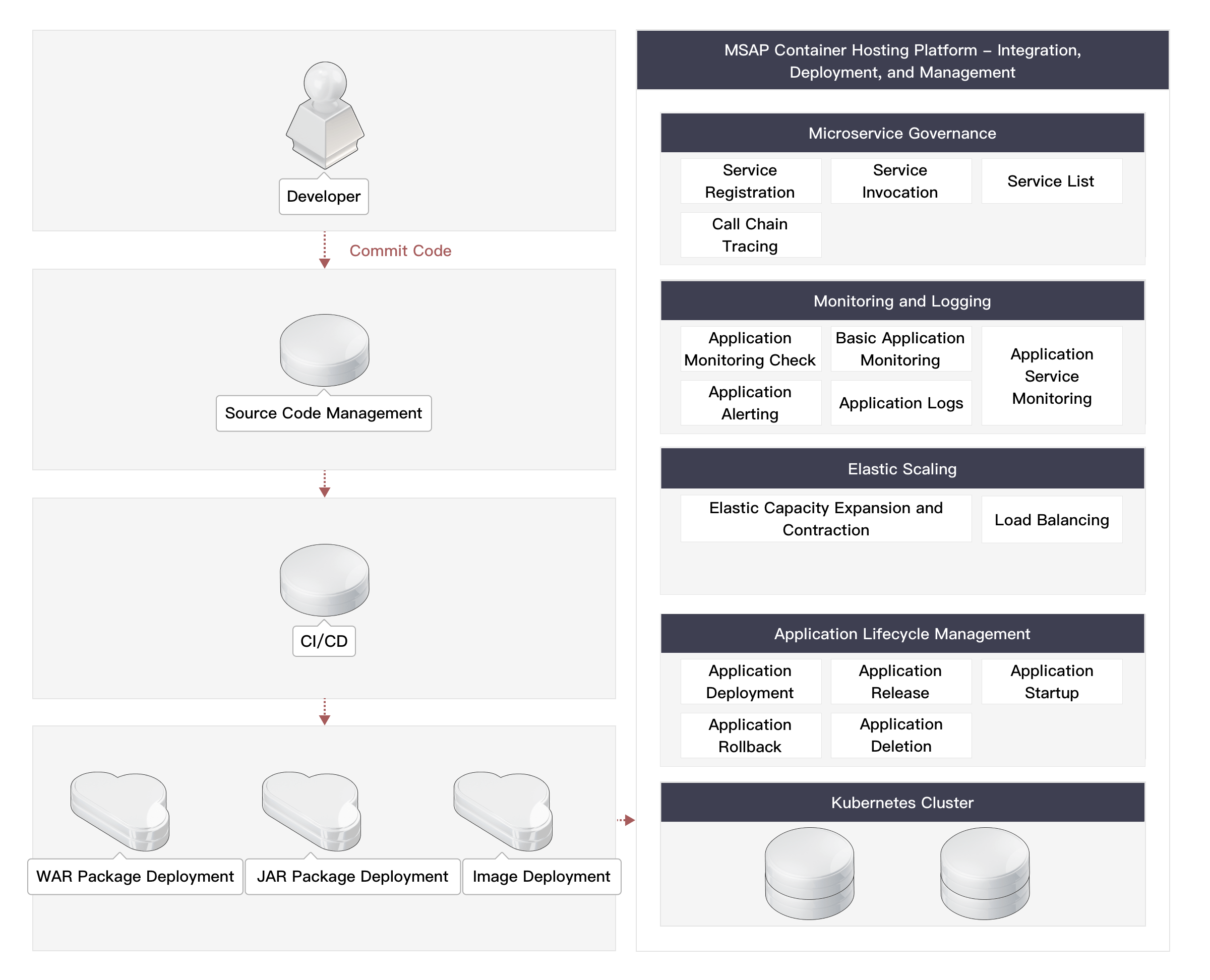 - MSAP supports hosting your applications in container form, with seamless integration with the Cloud Container Engine (CCE). You do not need to understand the intricate details of the underlying container services. Through the control panel, you can deploy container services and manage the entire lifecycle of applications within containers, including deployment, rollback, monitoring, service startup and shutdown, scaling, and more. This enables easy adoption of the latest container cloud service technologies, effectively reducing the cost of operations and maintenance manpower.