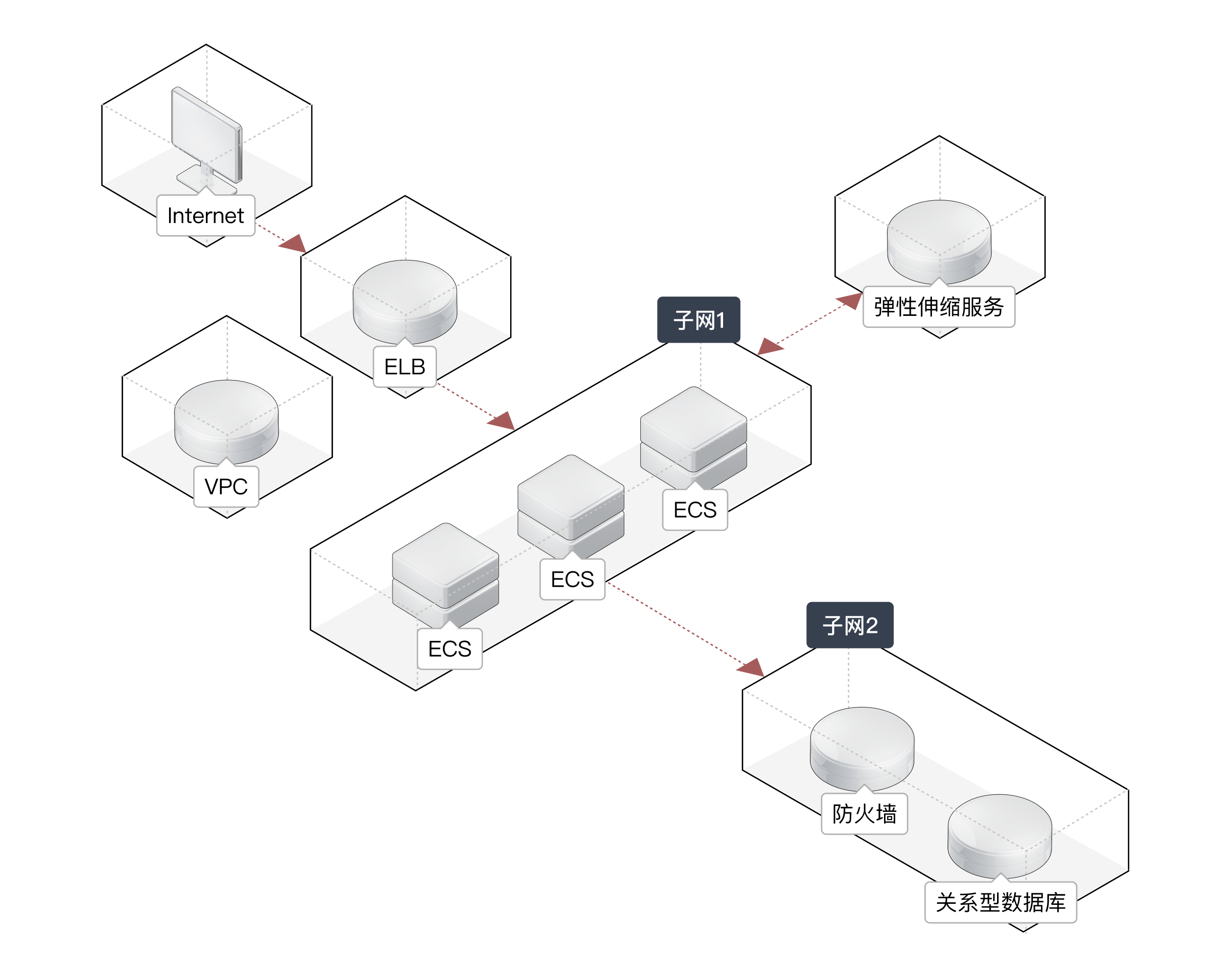 - 客户业务为典型的多层WEB应用,包含了WEB服务器和数据库服务器。WEB服务器需要对外提供服务,数据库服务器对内提供服务,WEB服务器和数据库服务器需要做业务隔离
