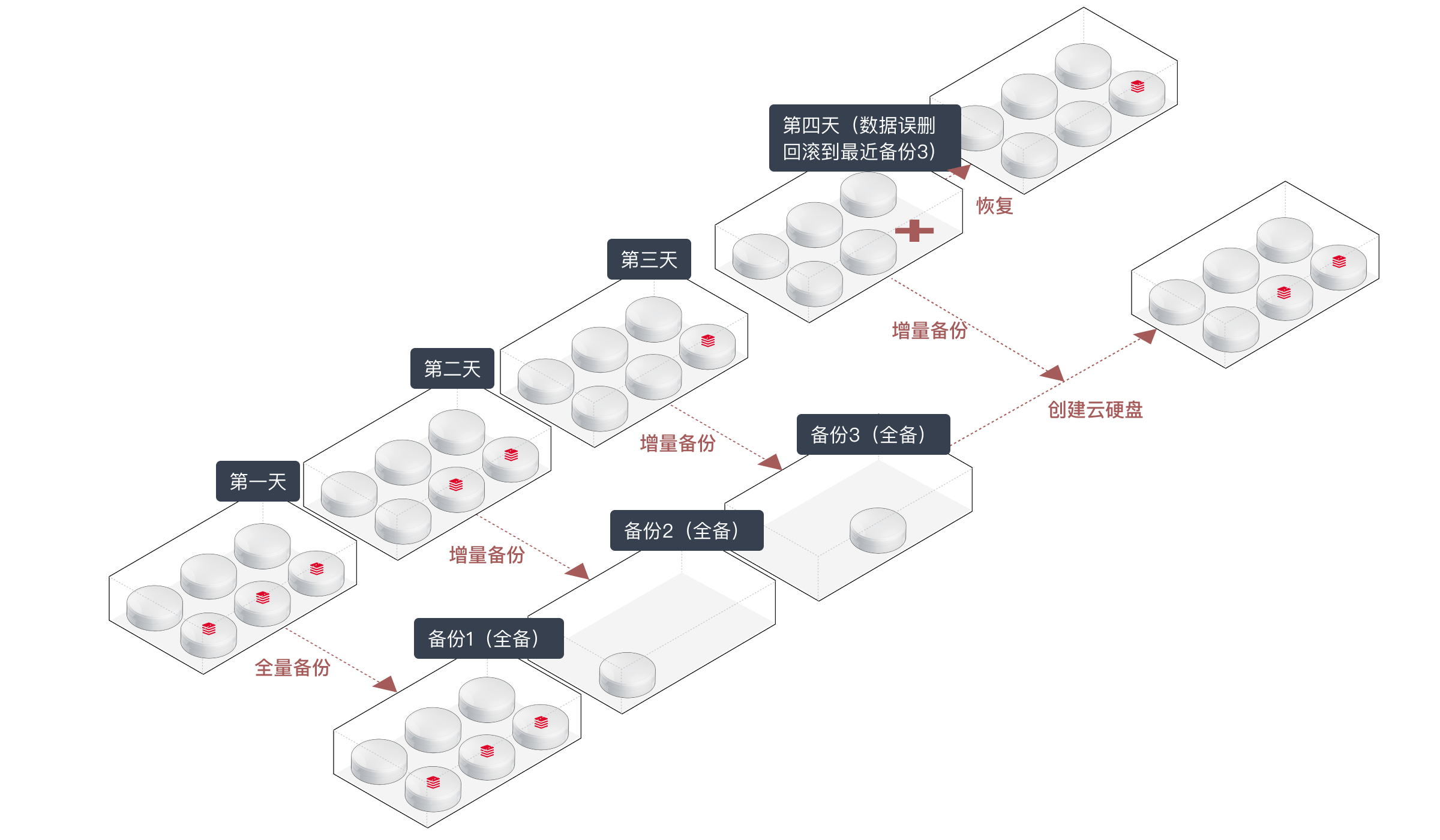 可针对性选择需要的数据盘备份,降低备份成本。备份首次采用全量备份,后续使用增量备份方式,为用户节省存储库空间,减少备份的空间占用