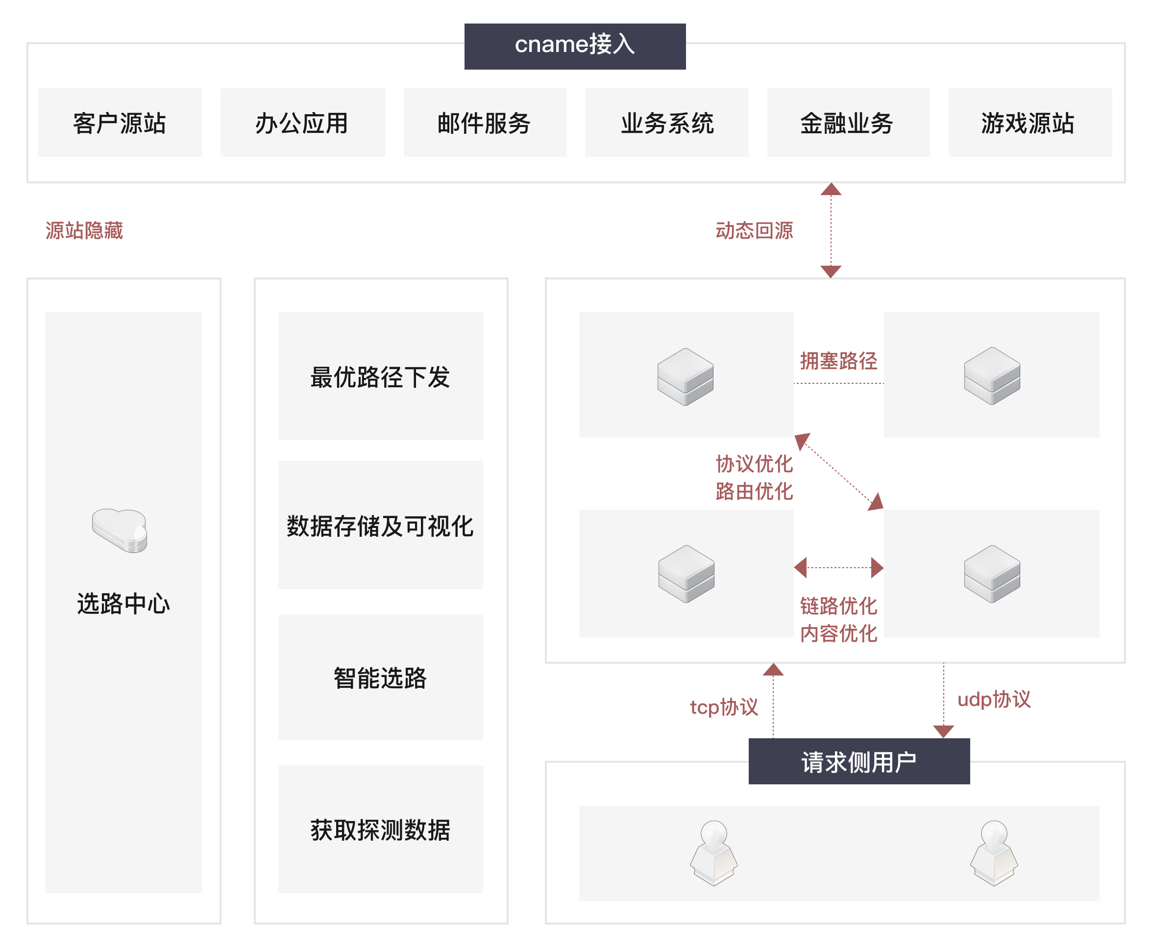 支持快速选路、稳健选路等多种选路方式,通过节点间实时探测,根据探测结果,结合自研的最优链路算法,获取最优路径回源