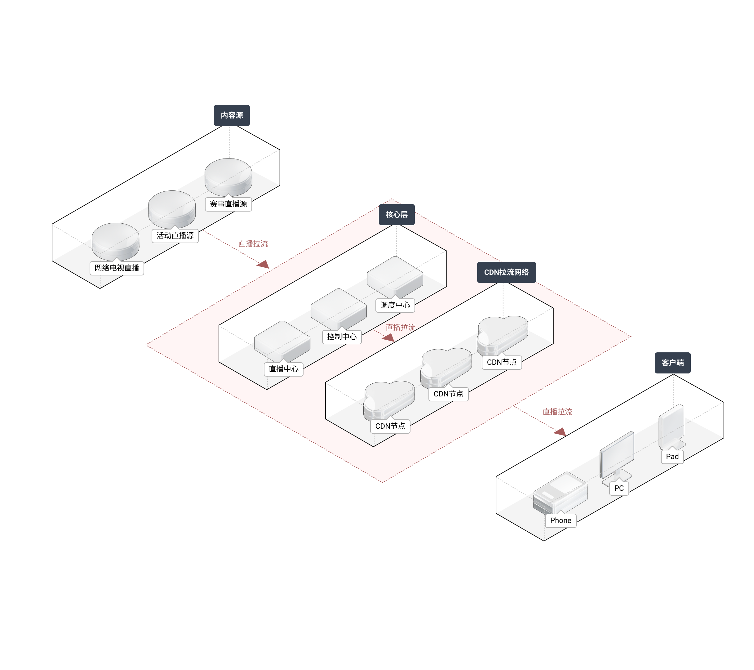 直播架构:支持主播推流到天翼云边缘节点的互动直播推拉流方式,以及主动回客户源站拉流再分发的回源拉流方式
