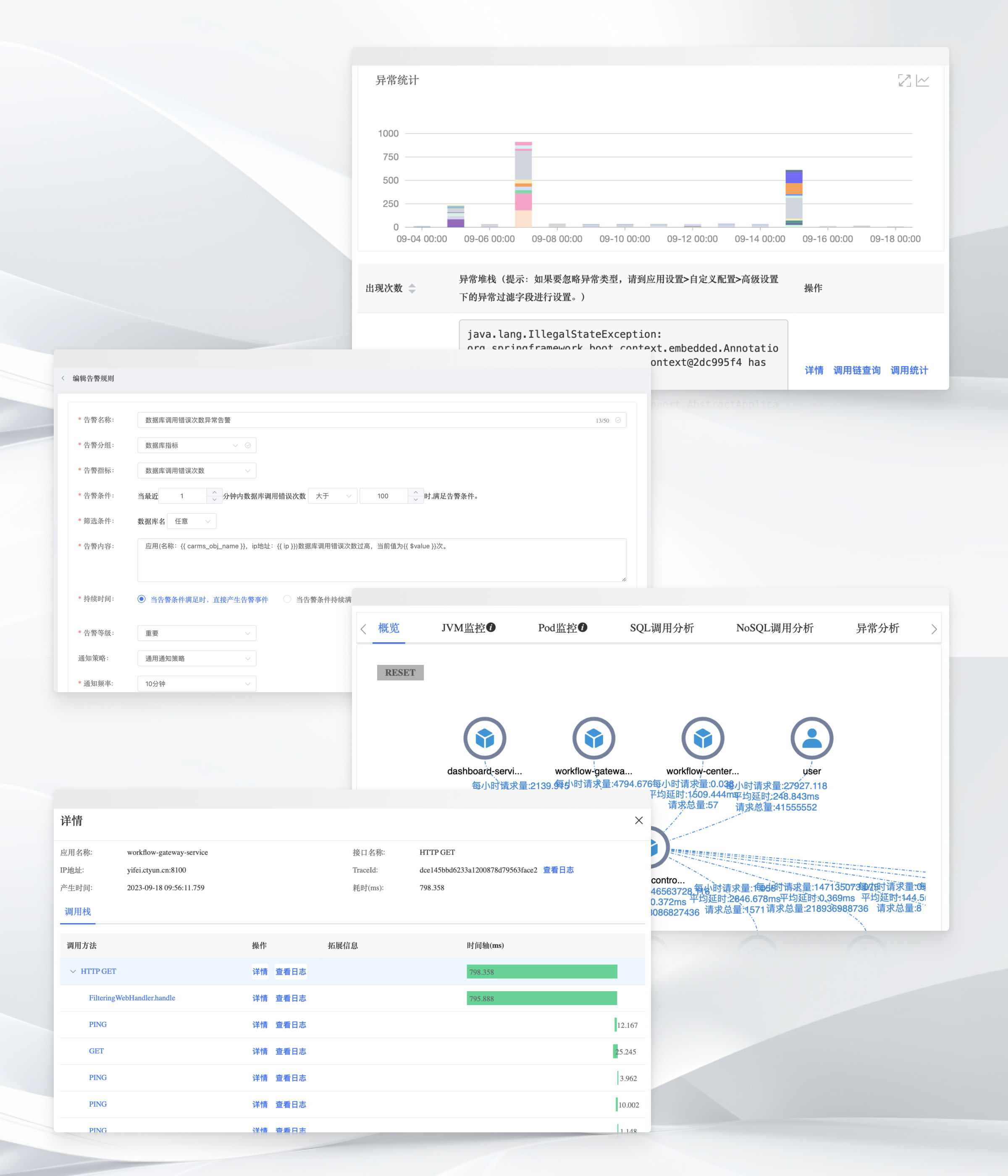 - 针对接口响应时间、异常调用、数据库、JVM等性能指标做一定阈值的告警,先于客户之前发现并解决问题。