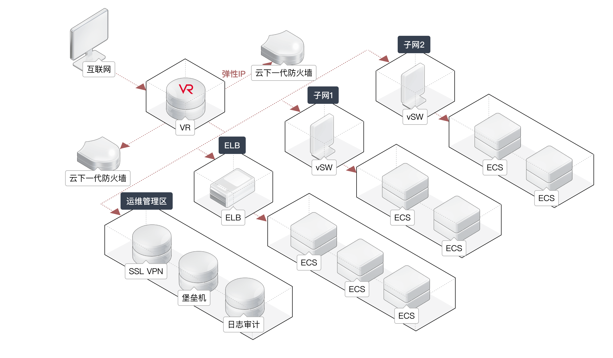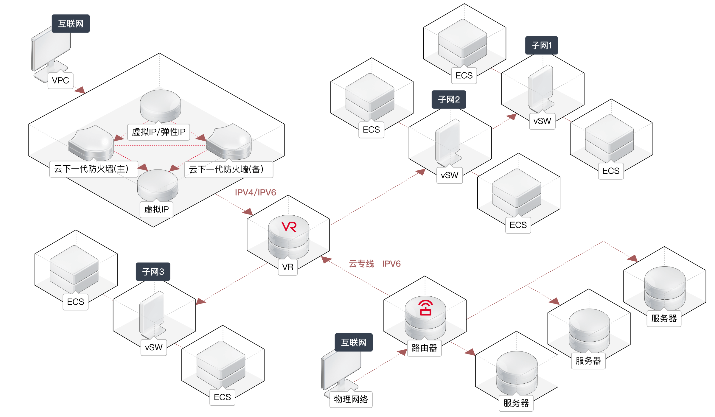 - 业务主机直接绑定弹性IP的安全风险极高,为了保证VPC内云主机的安全性,使用云下一代防火墙进行七层流量访问控制与检测,拦截病毒及入侵,为用户VPC安全保驾护航。