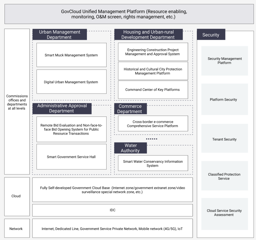 Government departments usually have a large number of service systems and scattered resources. The GovCloud solution could solve this problem and promote resource intensification and efficient management. Based on full-stack hybrid cloud, the GovCloud solution builds a secure and trusted digital government platform for government departments at provincial/municipal/county levels and promotes the intensive management and deployment of governmental service systems, thereby laying a solid foundation for the construction of Digital Government, Urban Brain and Smart City.